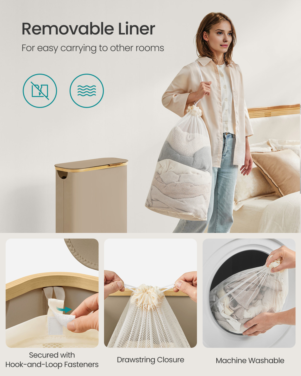 • Sac de plasă detașabil:Sacul poate fi îndepărtat cu ușurință și poate fi folosit și ca sac de rufe la spălare, simplificând sortarea hainelor.